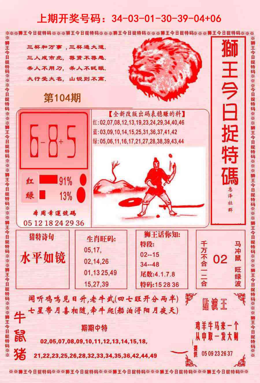104期:澳门六合彩红姐彩圖信封【狮王平特】每期自动更新